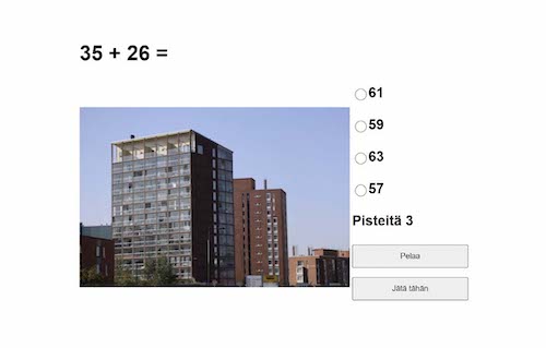 Kaiken summaajasiPelissä ratkaistaan yhteenlasku tehtäviä. Yhteenlaskettavien lukujen summaksi on neljä vastausvaihtoehtoa. Pelin nimi on Kaiken summaajasi. |